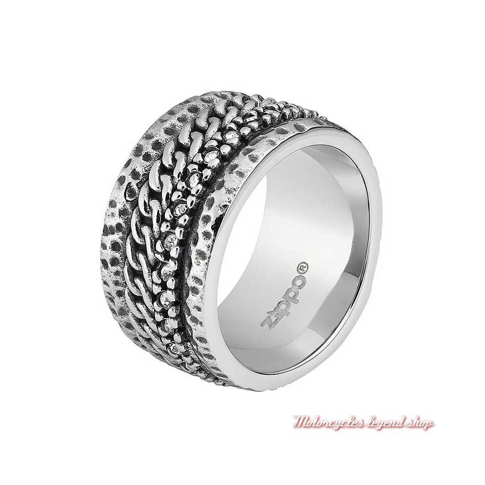 bague en acier inoxydable, argenté. Motif maille de chaine, rangée de strass délicats. Logo Zippo gravé à l'intérieur.
