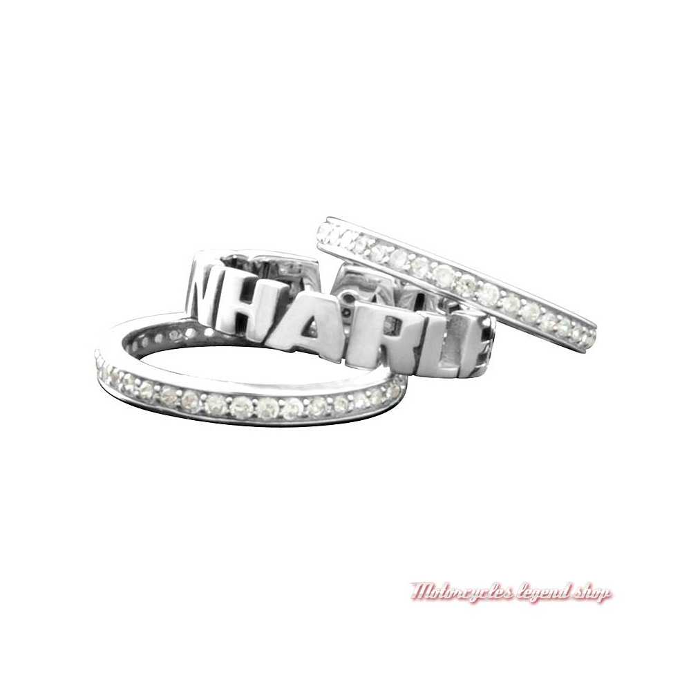 anneaux en argent 925 sterling, à superposer. Un anneau en lettrage Harley-Davidson gravé et deux anneaux sertis de strass.