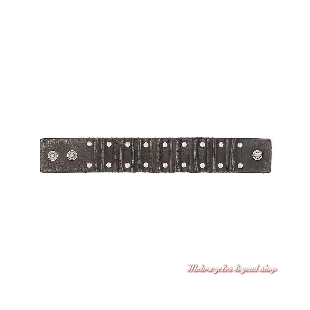 Manchette en cuir froncé. Rivets métal sur toute la longueur de la sangle. Fermeture réglable par boutons-pression. Graphisme Bar & Shield gravé sur le bouton pression de fermeture.