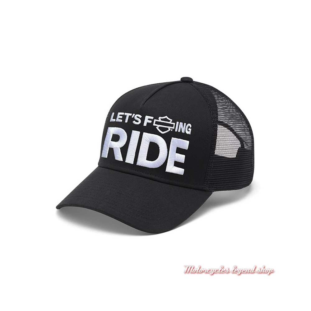 100 % sergé de coton, arrière en maille 100 % polyester. Visière incurvée. Graphisme Harley-Davidson® Let's F ing Ride. Arrière réglable