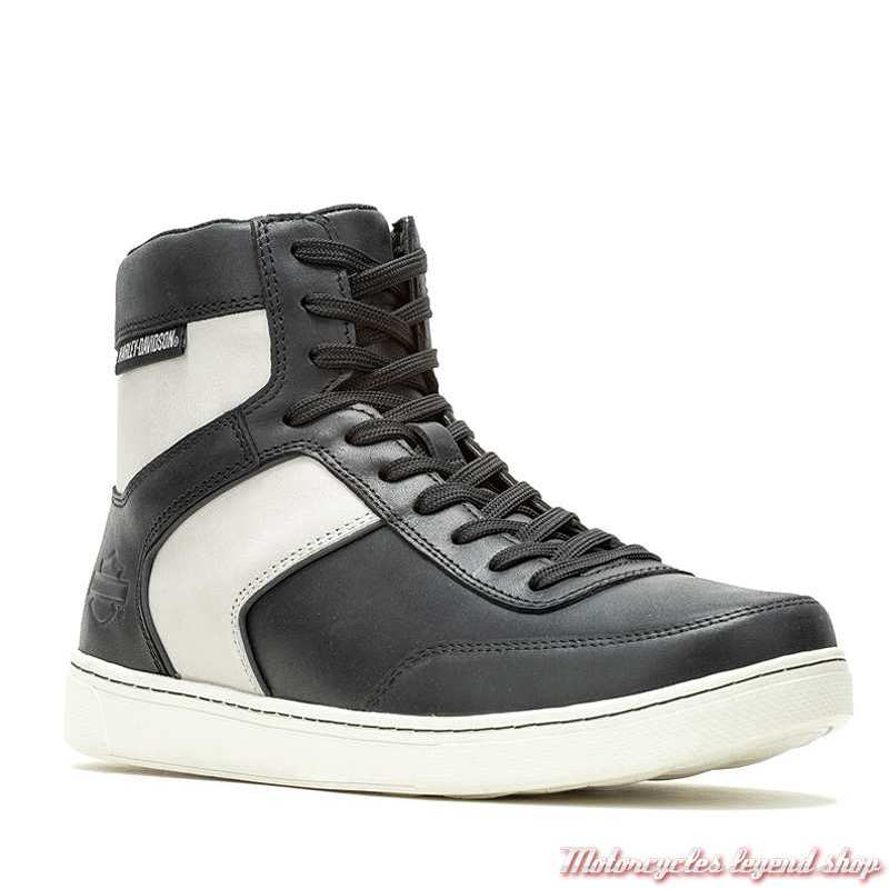 en cuir pleine fleur, à lacets, prévues pour la conduite, résistant à l'abrasion. Protection malléole Poron®. Intérieur maille. Passepoil réfléchissant 3M. Semelle caoutchouc blanche. Graphisme Bar & Shield® et étiquette Harley-Davidson® sur le côté.
