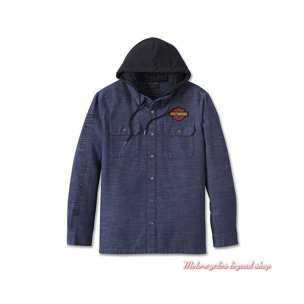 Chemise manches longues à capuche, 100 % coton dobby, lavé pour plus de douceur. Fermeture à boutons-pression. Deux poches poitrine à rabat pression. Poignets boutons-pression. Patch Bar & Shield brodé sur la poitrine gauche. Graphisme Harley-Davidson sur la manche droite.