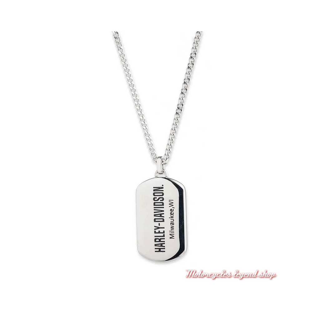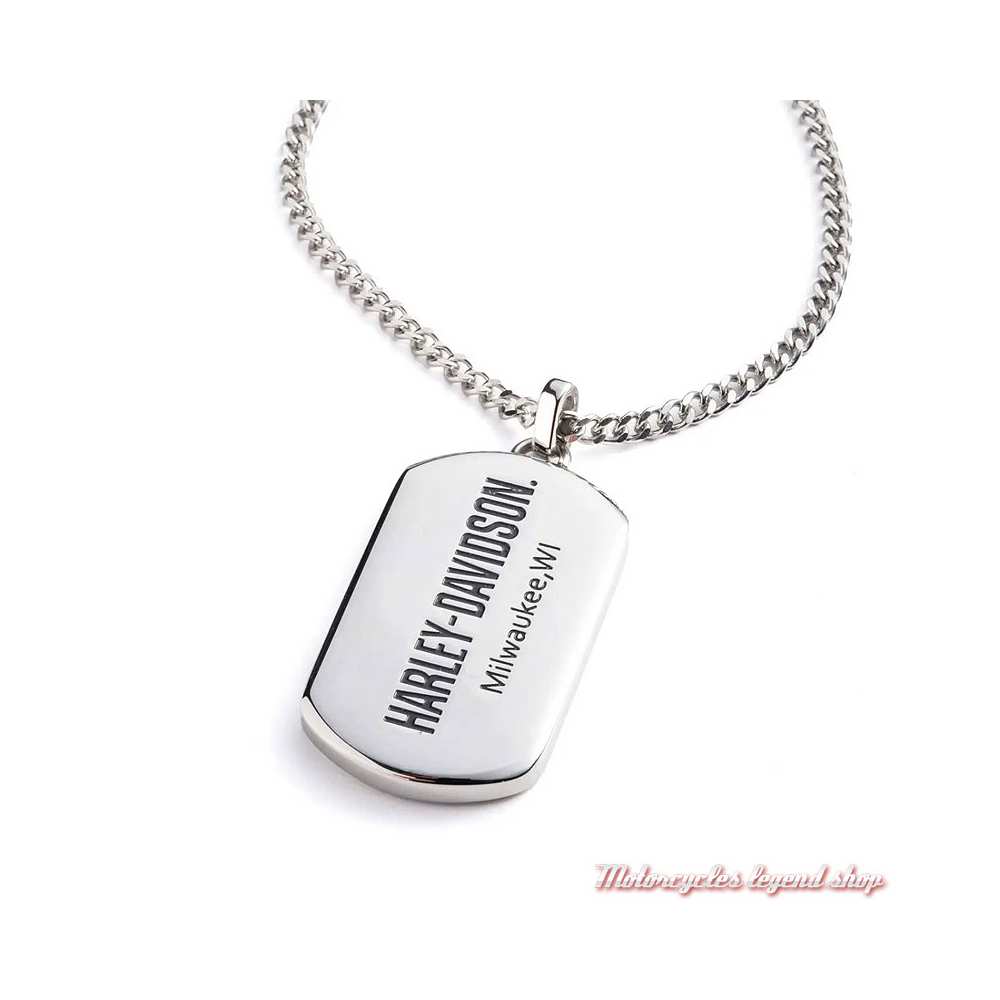 Pendentif plaque d'identification Harley-Davidson Milwaukee en acier inoxydable gravé. Chaîne en acier inoxydable