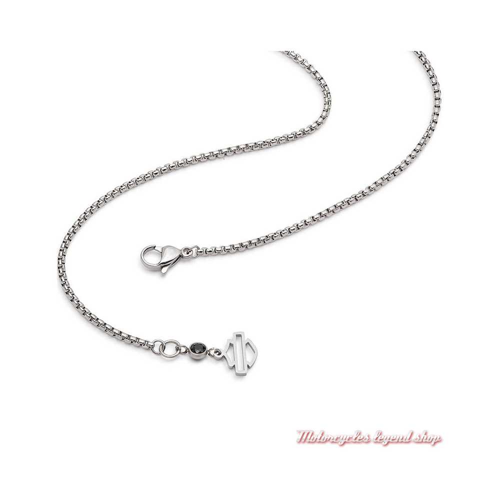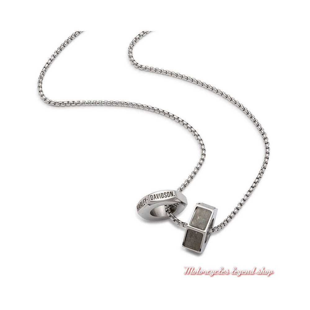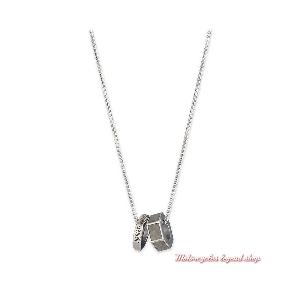 2 anneaux en forme d'écrou en acier inoxydable gravé. Graphisme Harley-Davidson sur l'un, le deuxième orné de nacre. Chaîne en acier inoxydable