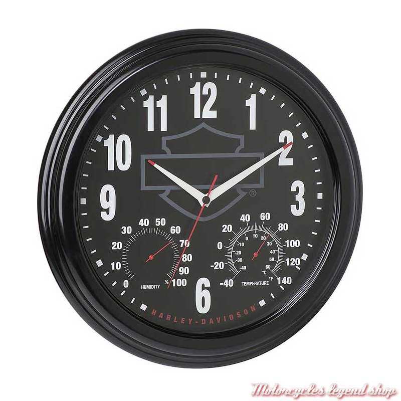 horloge d'extérieur à mouvement perpétuel, thermomètre (Celsius/Fahrenheit) et jauge d'humidité. boîtier en plastique, cadran noir, chiffres phosphorescents. Logo Bar & Shield® sur le cadran. Fonctionne avec pile AA (non fournie).