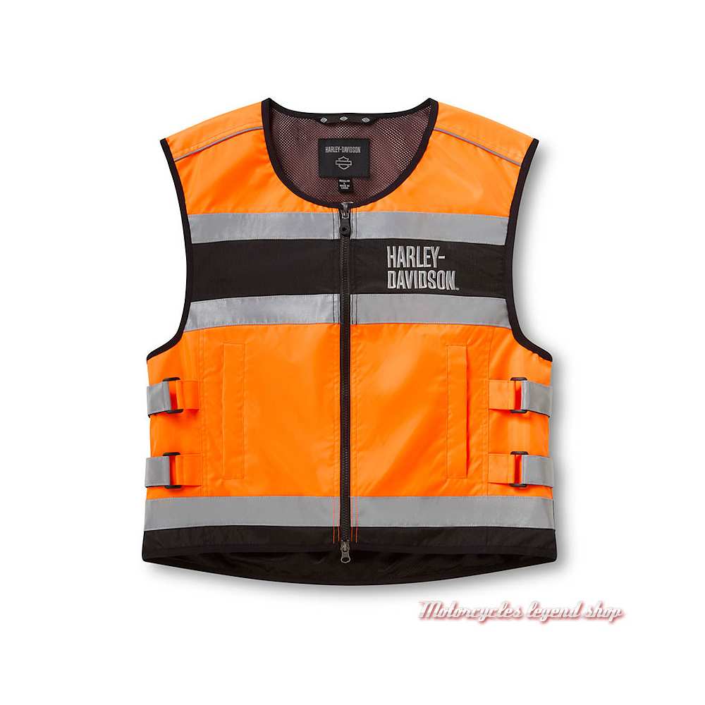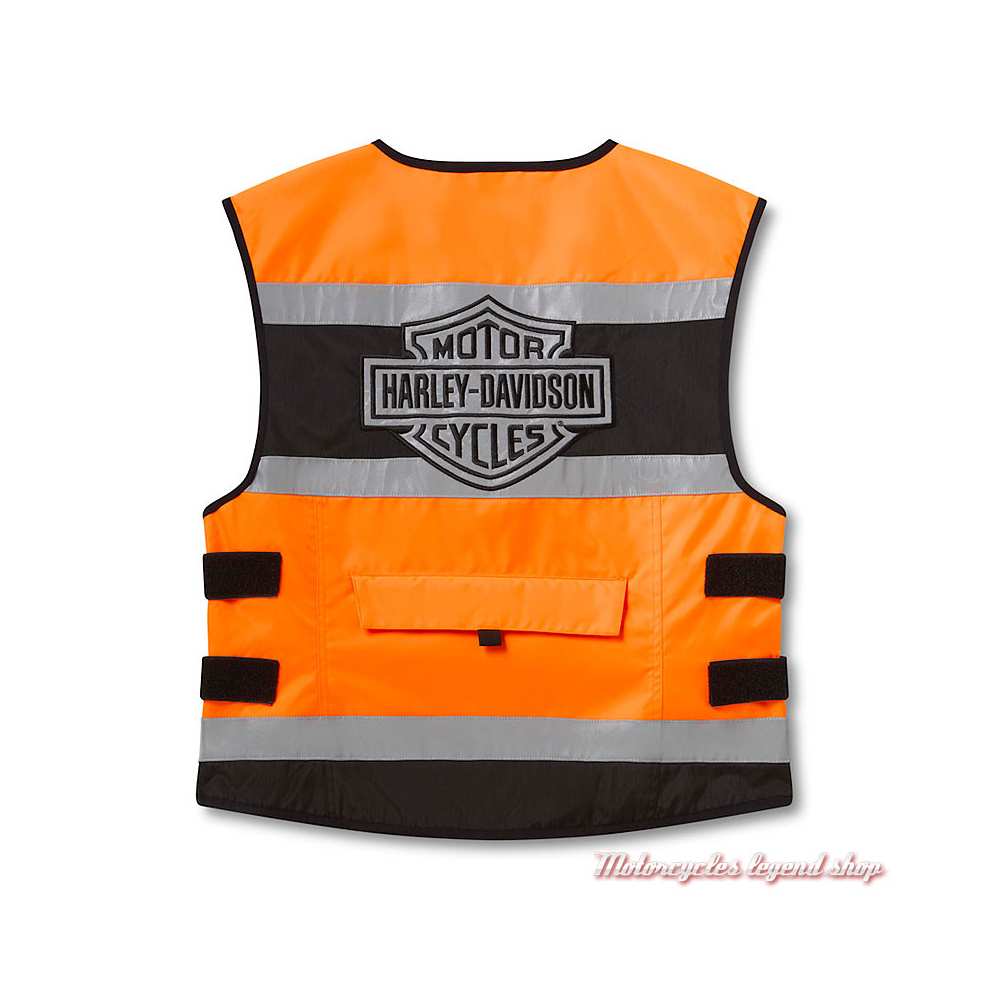 en polyester oxford. Côtés réglables pour un ajustement sécurisé. 2 poches zippées. Poche dorsale horizontale zippée à rabat. Bandes réfléchissantes 3M Scotchlite pour une visibilité accrue. Logo Harley-Davidson® sur la poitrine gauche, Bar & Shield® réfléchissant 3M Scotchlite dans le dos.