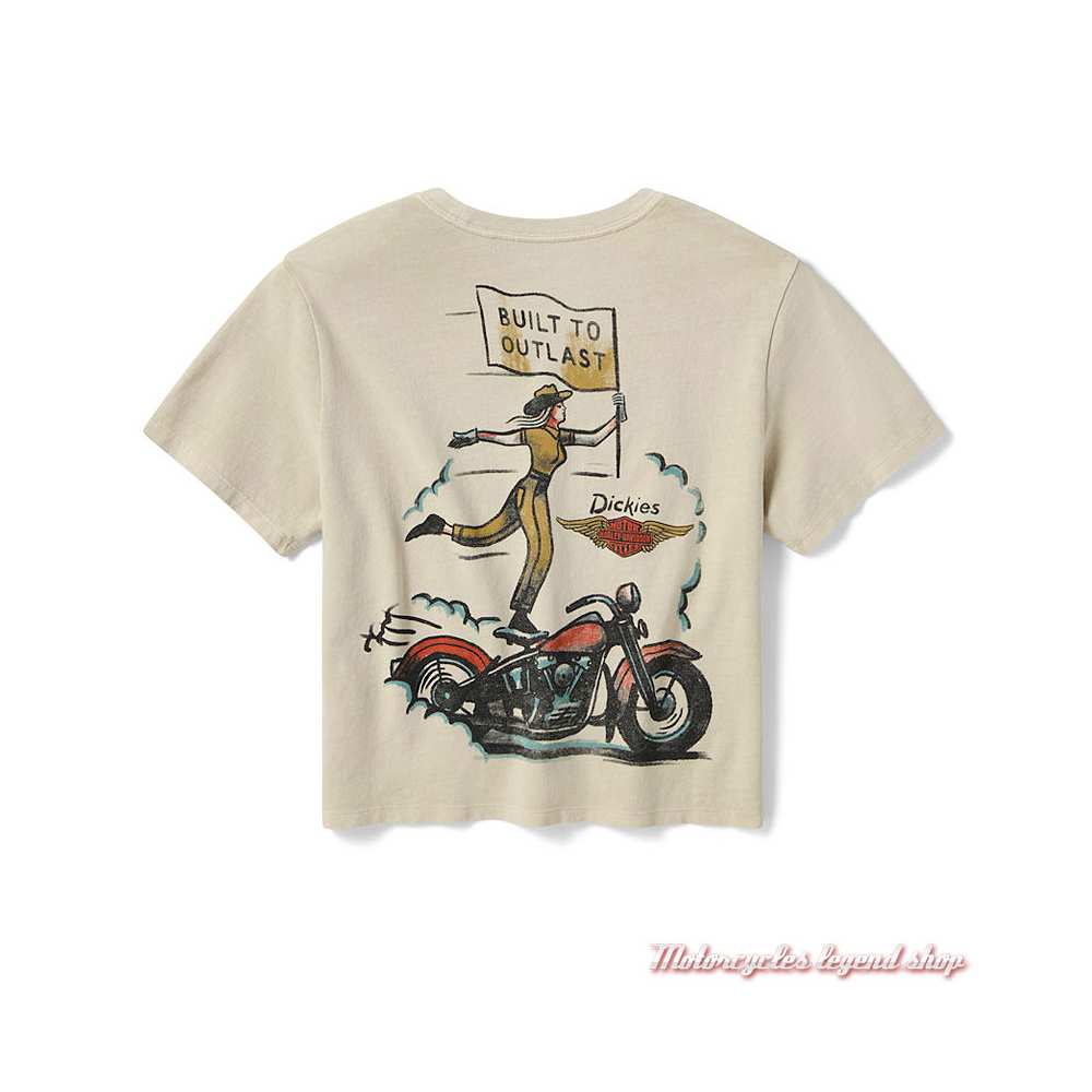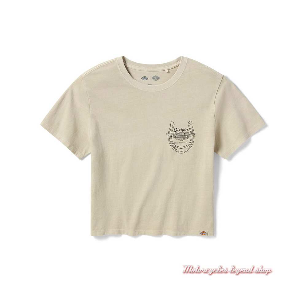 en jersey, coupe courte 100 % coton délavé. Manches courtes. Coupe boyfriend carré. Col rond. Graphisme Bar & Shield® ailé, Dickies® et fer à cheval imprimé sur la poitrine gauche. Graphisme moto, cow girl vintage imprimé, aspect vieilli, dans le dos. Etiquette Dickies® cousue à la taille.