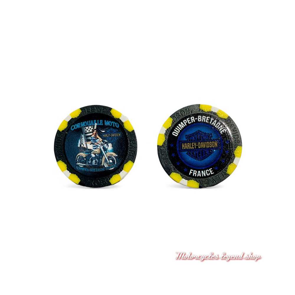 jeton à collectionner. logo bar & Shield Harley-Davidson Quimper Bretagne d'un côté, notre Bigoudène Cornouaille Moto en couleur de l'autre côté.
