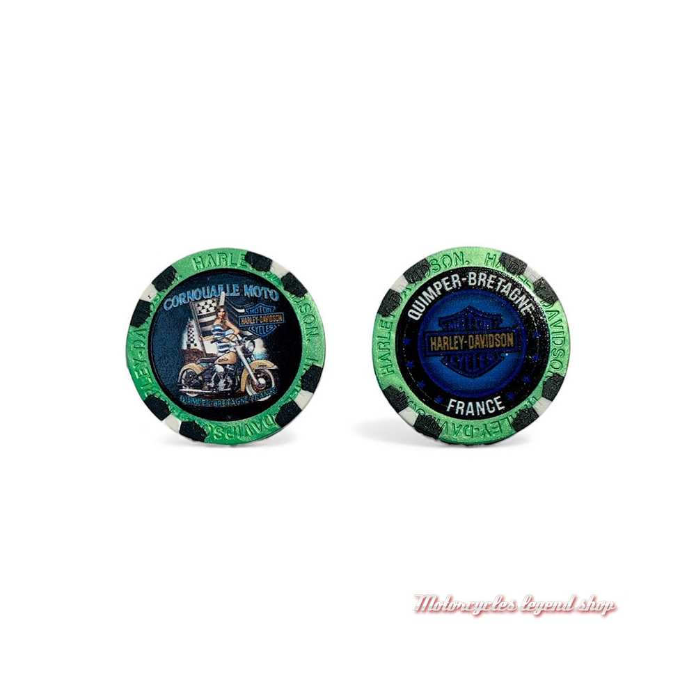 jeton à collectionner. logo bar & Shield Harley-Davidson Quimper Bretagne d'un côté, notre Bigoudène Cornouaille Moto en couleur de l'autre côté.