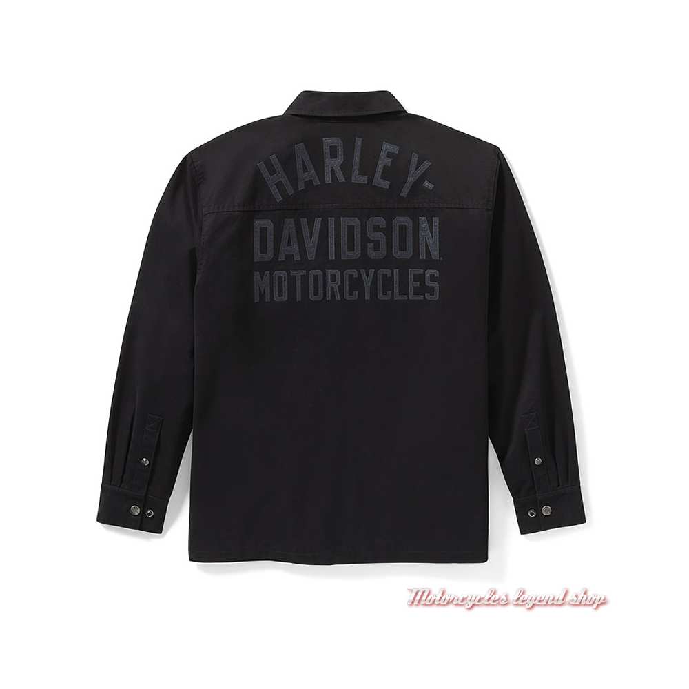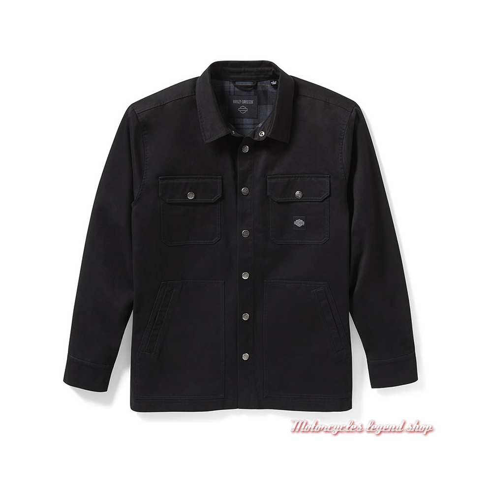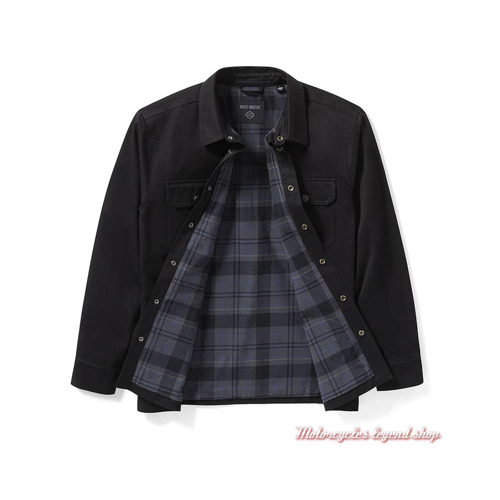 chemise 100 % coton sergé brossé. Doublure en sergé coton à carreaux gris et noir. Manches longues. Fermeture à boutons-pression. Deux poches poitrine à pressions. Deux poches réchauffe mains. Poignets boutons-pression. Etiquette Bar & Shield® brodé sur la poitrine gauche. Graphisme Harley-Davidson® en feutrine dans le dos.