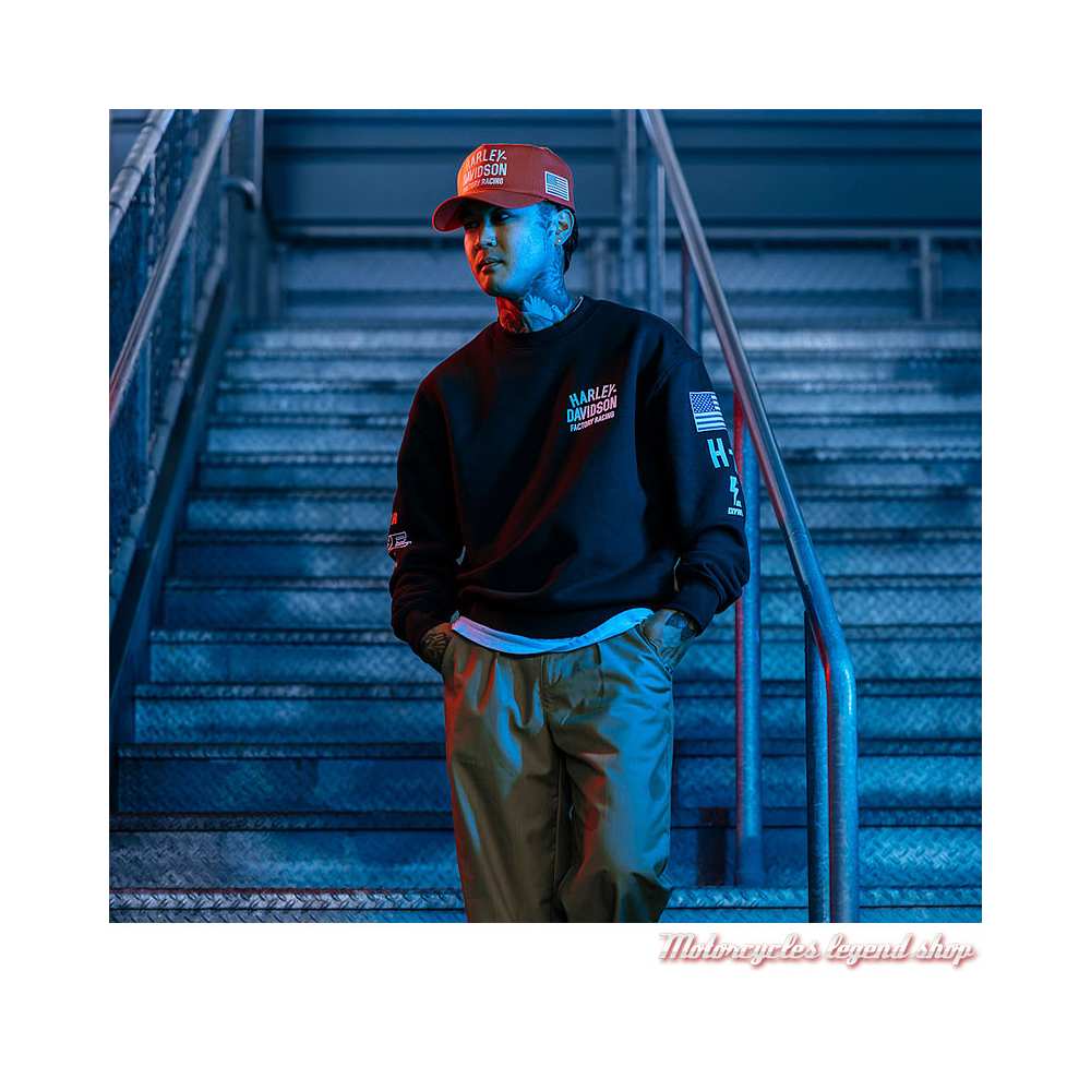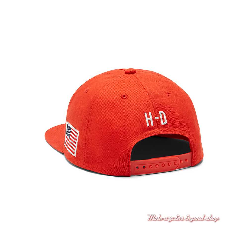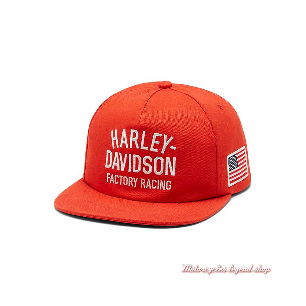 100 % sergé de coton. Visière plate. Graphisme Factory Racing Harley-Davidson® brodé sur le devant. Drapeau USA sur le côté gauche. Arrière réglable