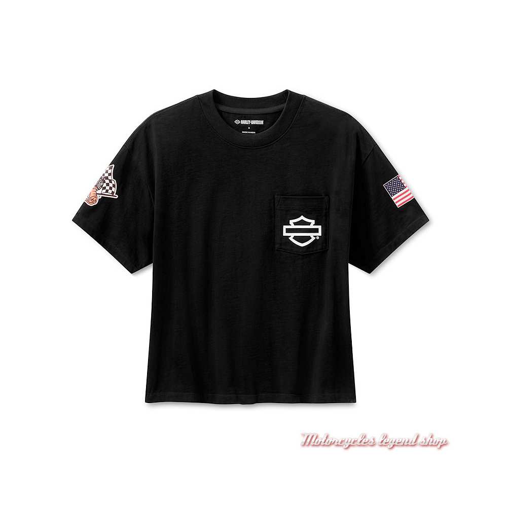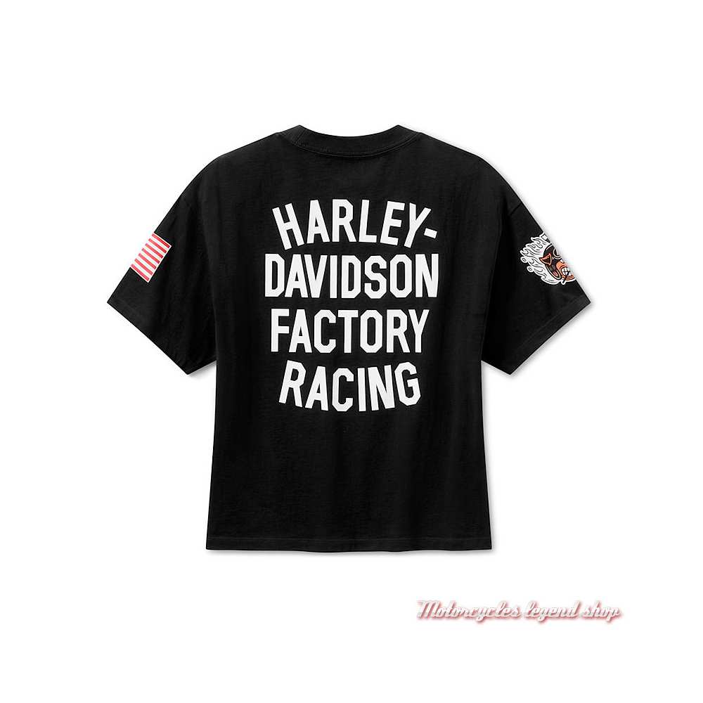 Coupe courte et oversize. Manches courtes, 100 % jersey coton, Col rond côtelé. Poche de poitrine gauche. Graphisme Bar & Shield® Silhouette sur la poche. Drapeau USA sur la manche gauche. Graphisme cochon compétition, en référence aux courses de 1900, sur la manche droite. Graphisme Harley-Davidson® Factory Racing imprimé dans le dos.