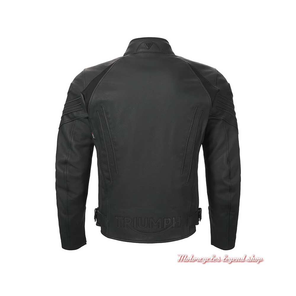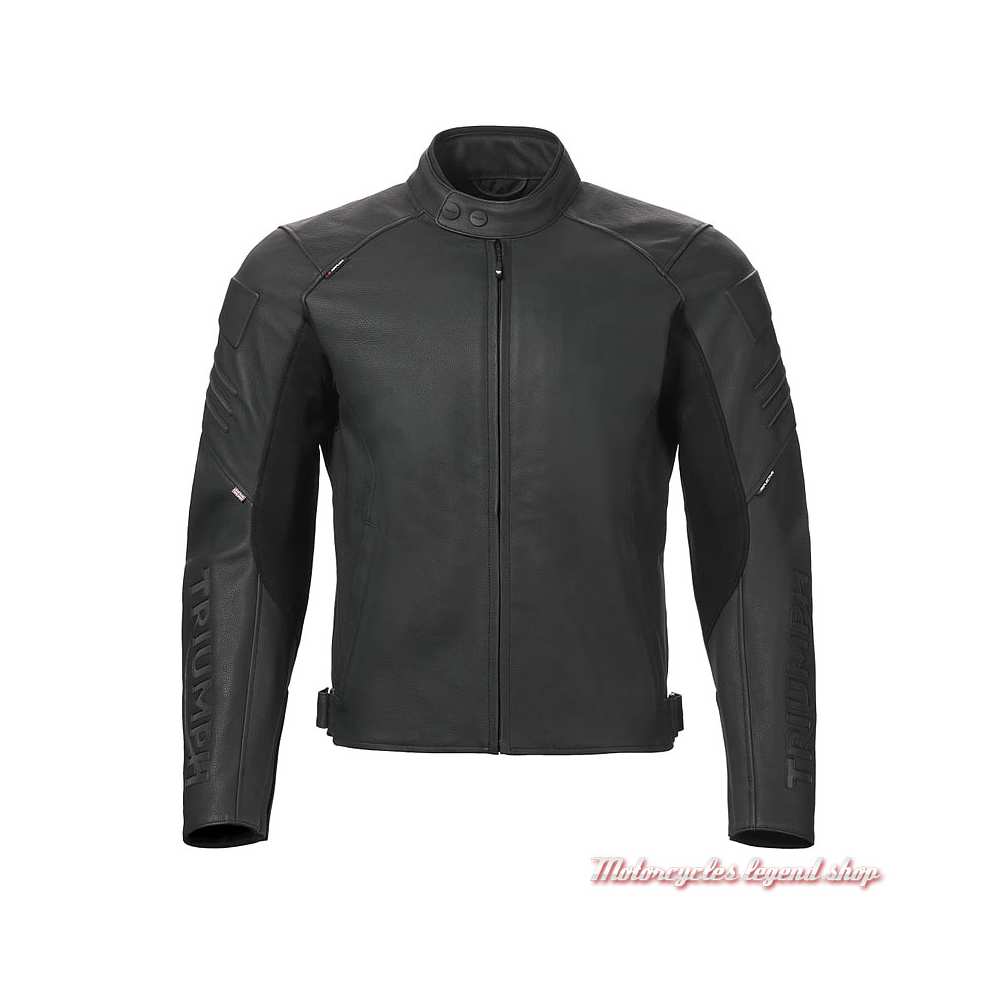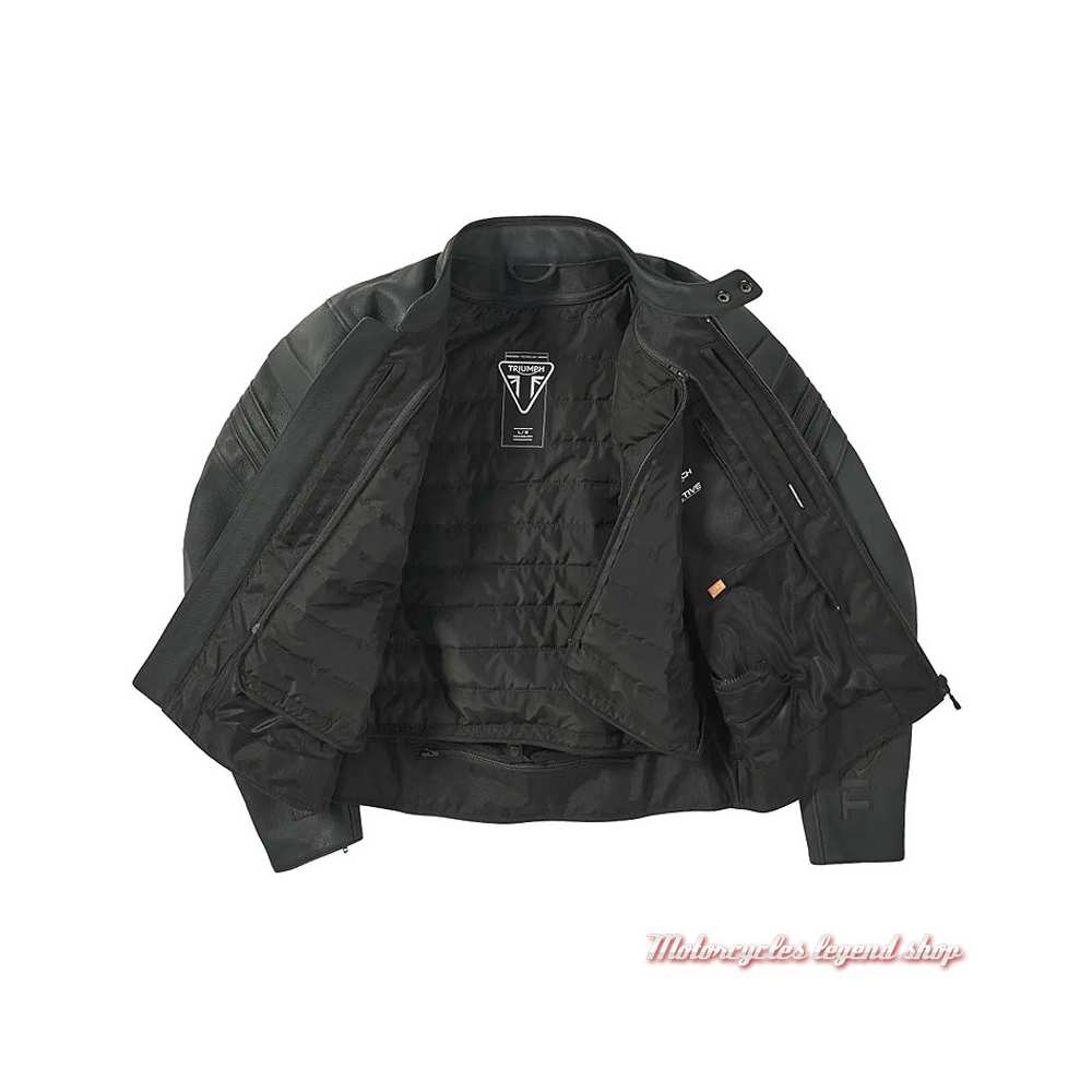 Cuir pleine fleur. Doublure thermique amovible. Double en maille respirante. Empiècements extensibles TriStretch ergonomiques. Taille réglable. Aération sous les manches. Fermeture zippée. Zips aux poignets. Deux poches réchauffe main zippées. Col officier, fermeture à bouton pression. Protections D3O amovibles au niveau des épaules et des coudes, certifiés CE selon la norme EN 1621-1:2012. Protection dorsale en option. Zip de connexion aux jeans de la gamme. Graphisme Triumph réfléchissant dans le bas du dos et graphisme Triumph sur les avant bras. Inserts réfléchissants dans le dos.