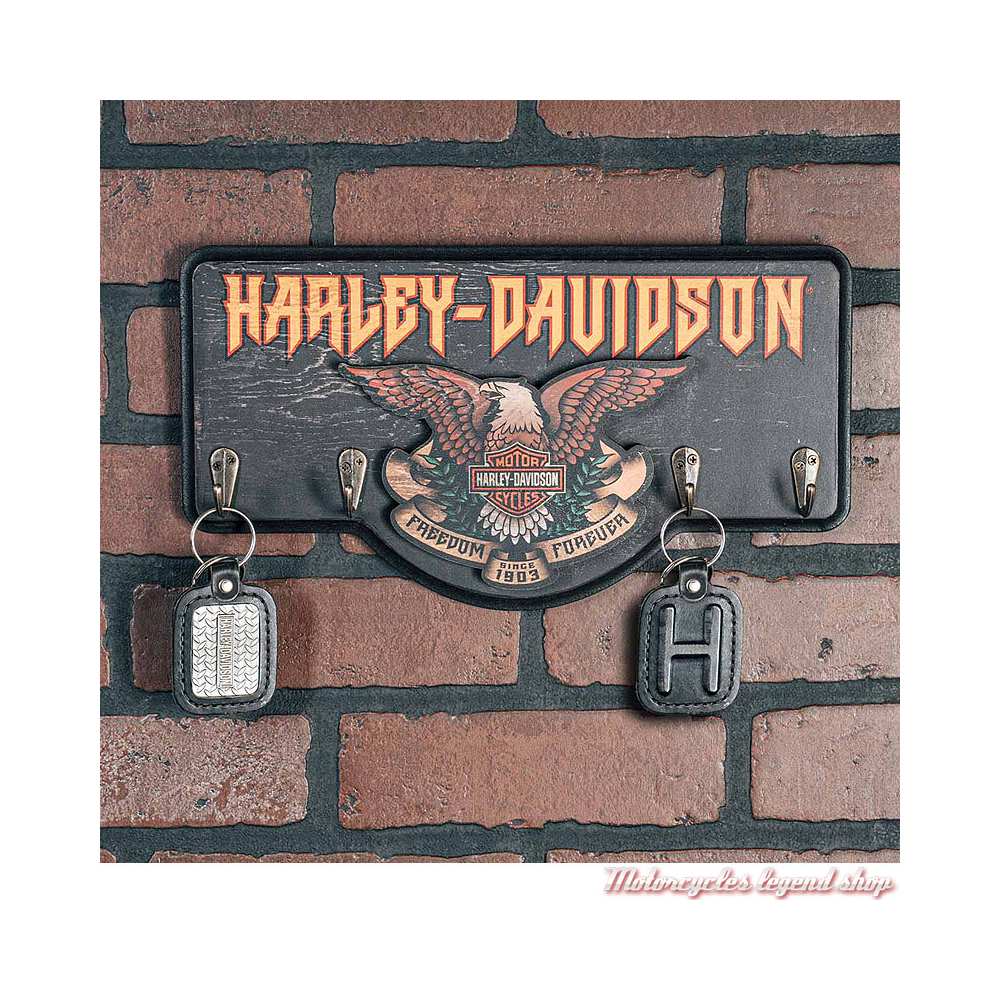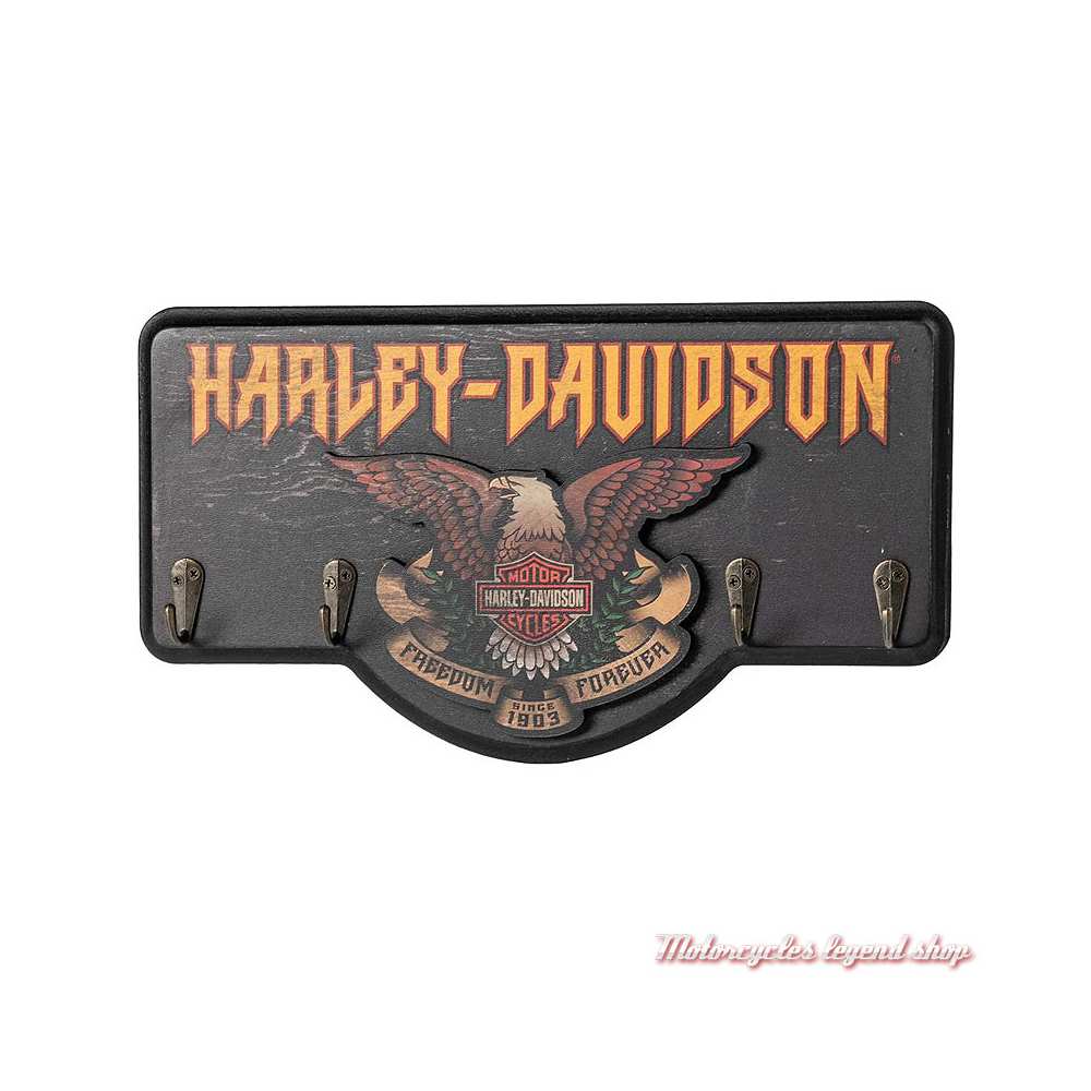 Support en bois finition usée. 4 crochets en métal cuivré pour suspendre les clés de vos machines. Graphisme Harley-Davidson Racing et aigle de Milwaukee. Supports de fixation au dos.