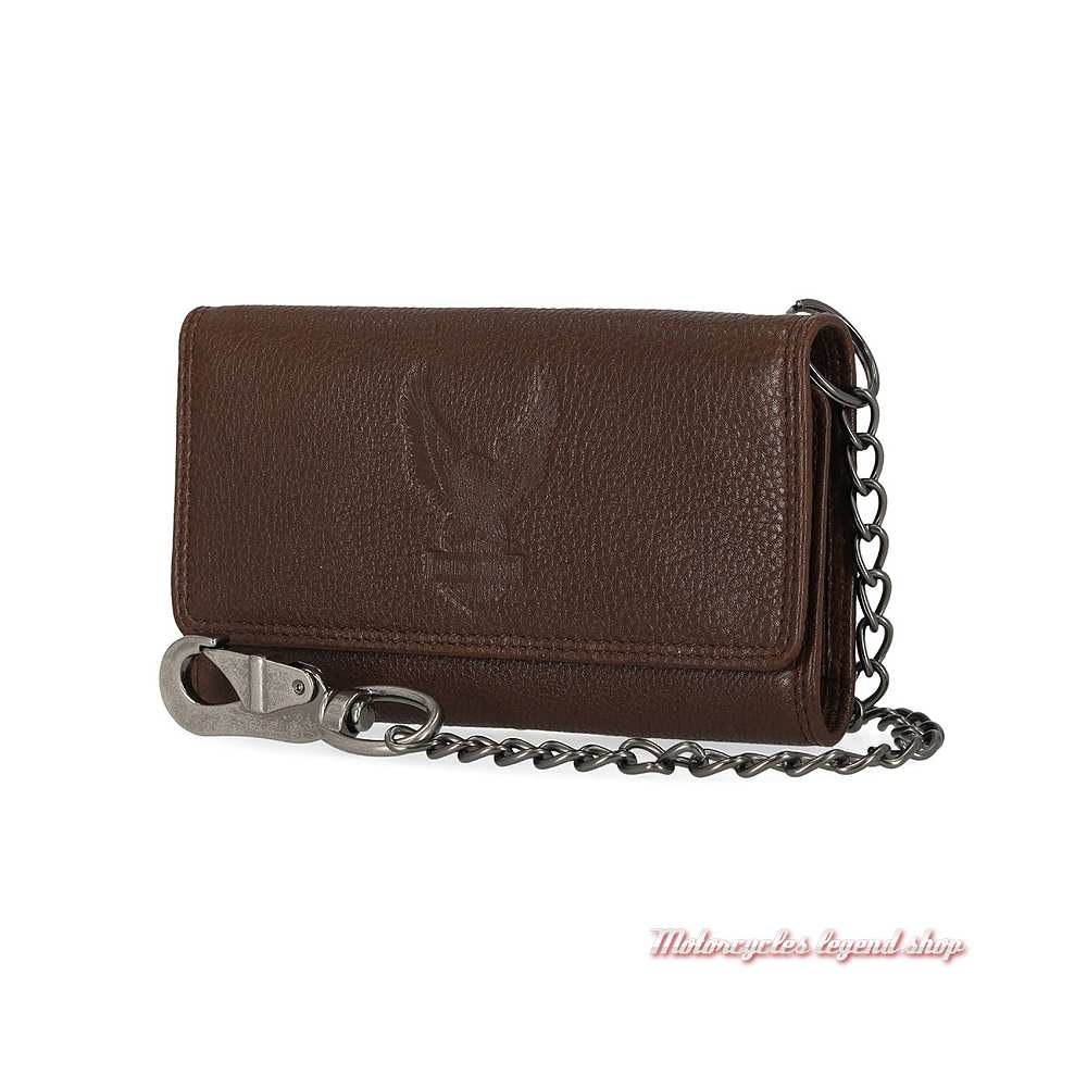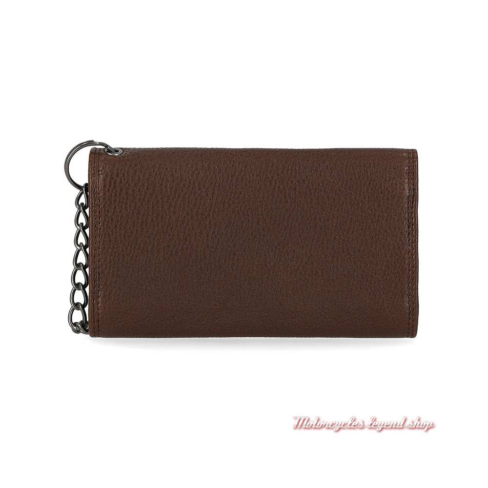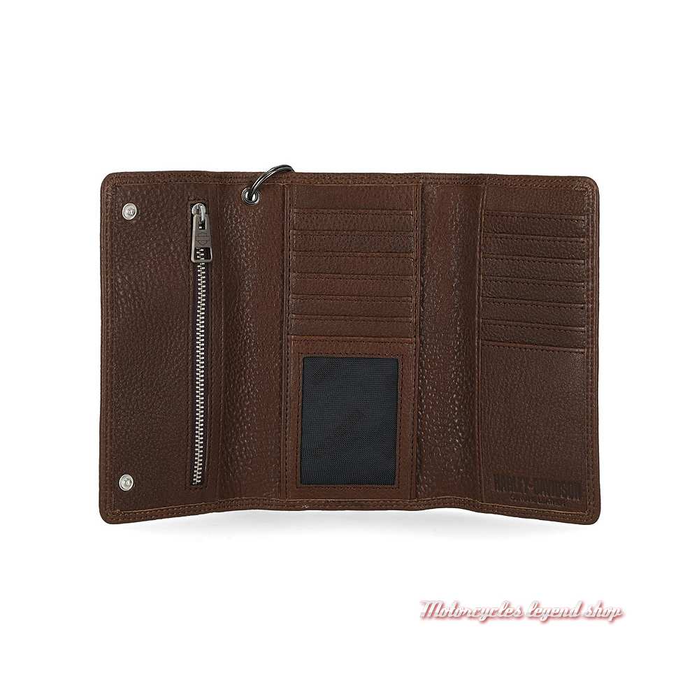 trois volets intérieurs comprenant 14 emplacements pour cartes format CB. Compartiment à billets. Porte monnaies zippé. Graphisme aigle et Bar & Shield® embossé. Fermeture par boutons-pression. Chaine amovible et mousqueton. Protection RFID.
