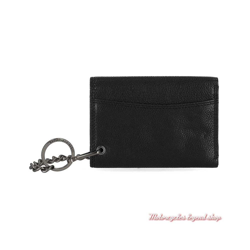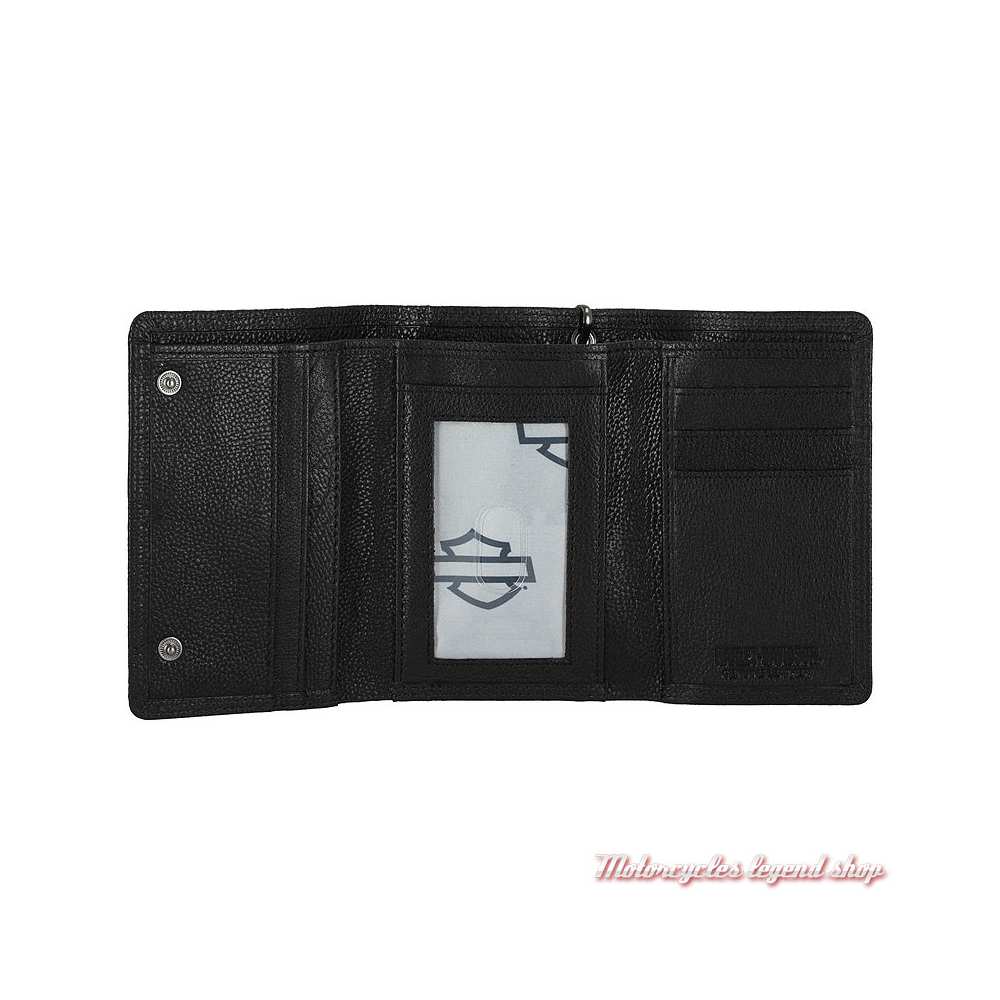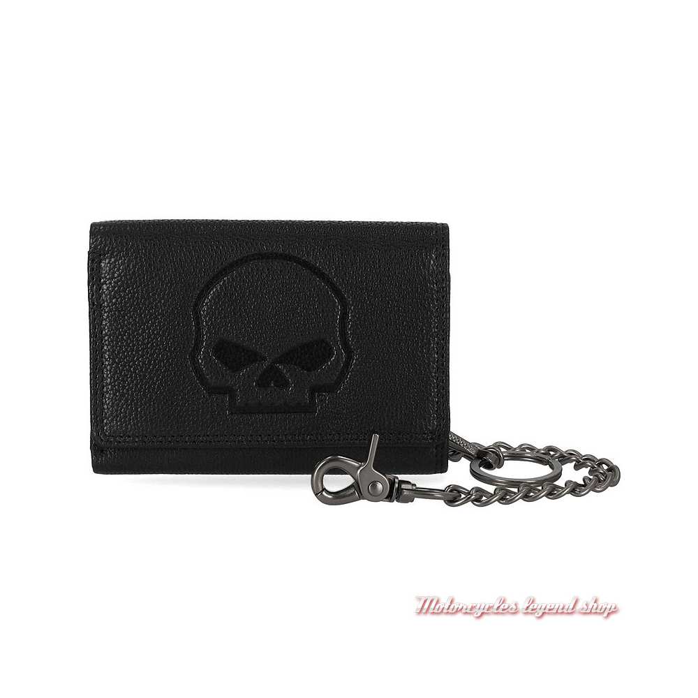 trois volets intérieurs comprenant 6 emplacements pour cartes format CB. Compartiment à billets sur la tranche du portefeuille déplié. Graphisme Skull Willie G® embossé. Fermeture par boutons-pression. Chaine amovible et mousqueton. Protection RFID.
