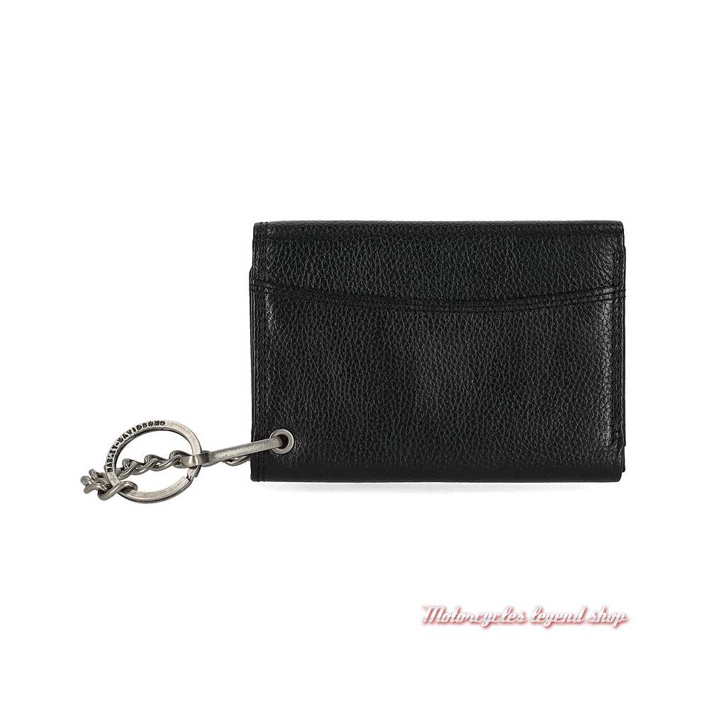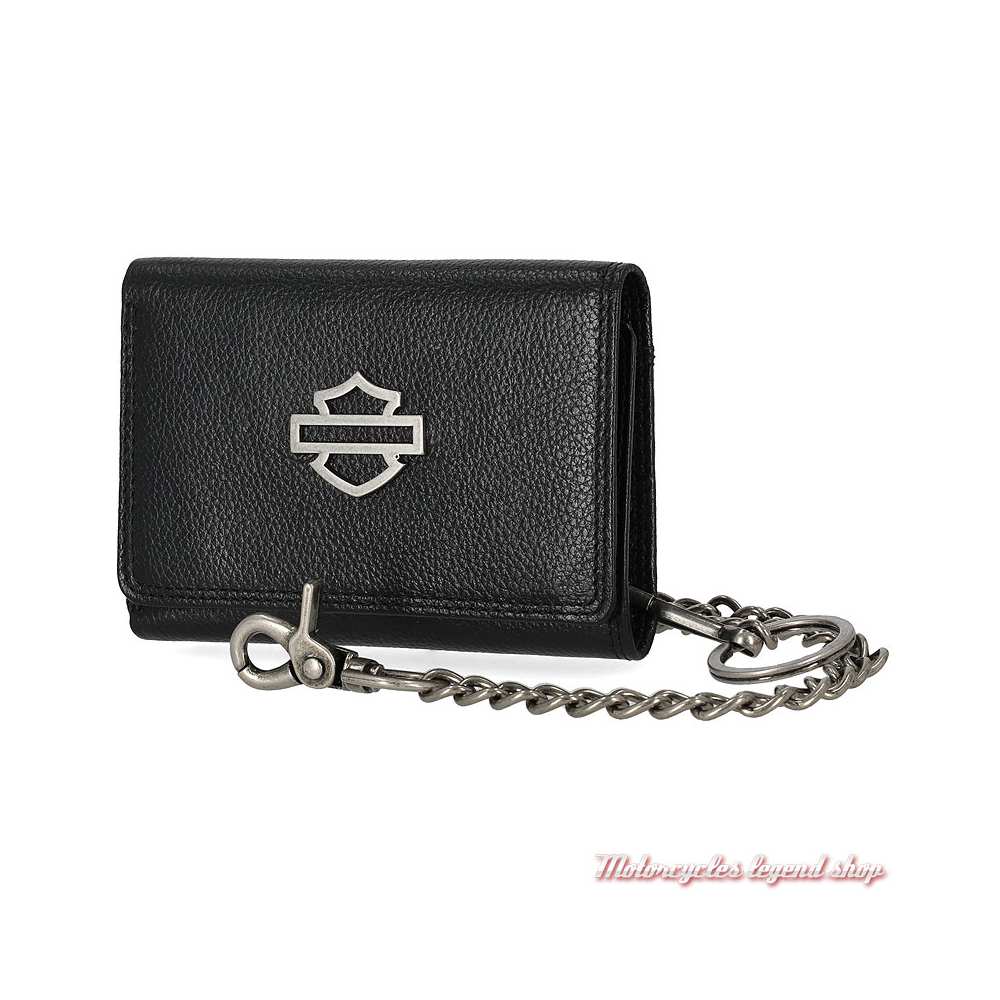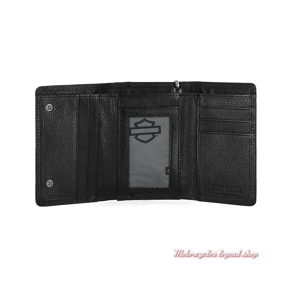 trois volets intérieurs comprenant 6 emplacements pour cartes format CB. Compartiment à billets sur la tranche du portefeuille déplié. Graphisme Bar & Shield® Silhouette metal. Fermeture par boutons-pression. Chaine amovible et mousqueton. Protection RFID.