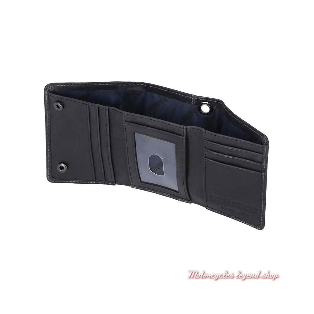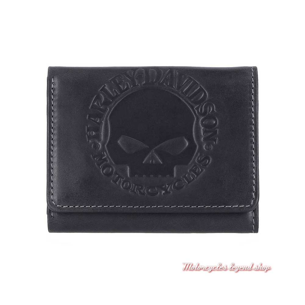 trois volets intérieurs comprenant 6 emplacements pour cartes format CB, emplacement à billets sur la tranche. Fenêtre identification. Protection RFID. Graphisme Skull Willie G. Harley-Davidson® embossé. Fermeture à pressions.