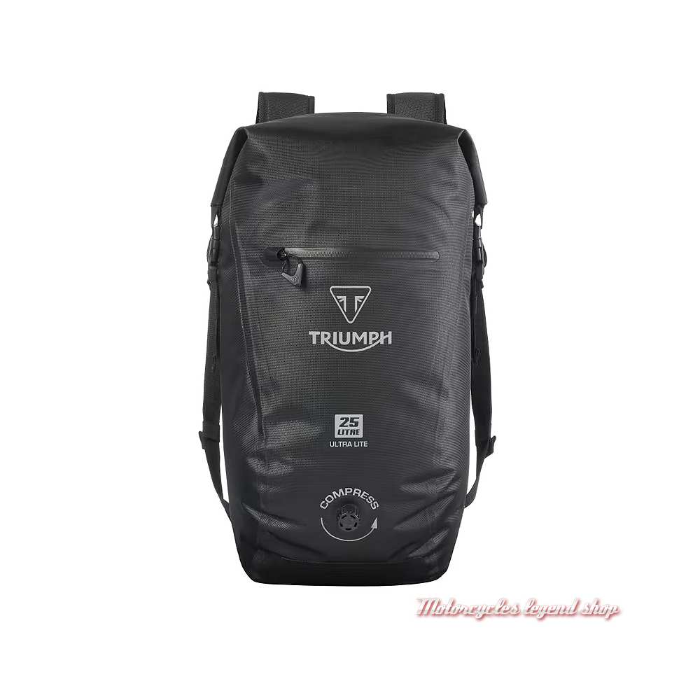 Sac à dos léger et imperméable, en polyuréthane, d'une capacité de 25 litres, aux coutures étanches. Système de rembourrage Airflow qui permet à l’air de circuler pour diminuer la chaleur et la transpiration au niveau du dos du motard. La fonction roll-top facile d’accès vous permet de comprimer le sac grâce à une soupape et de réduire son volume selon vos besoins. Comprend une poche supérieure supplémentaire. Sangle sternale. Bretelles renforcées et rembourrées. Logo Triumph.
