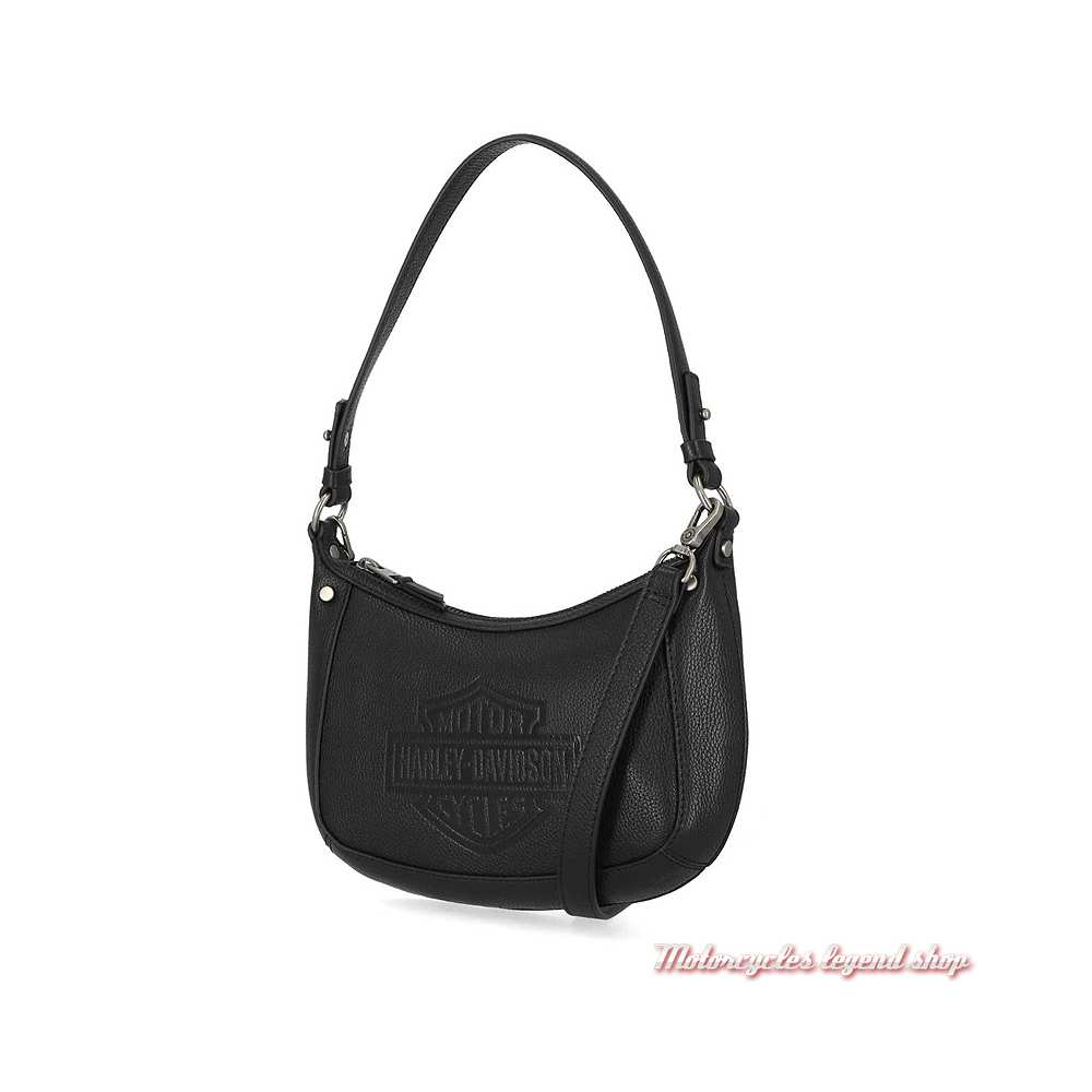 en cuir. 1 anse fixe. Fermeture zippée. Doublure satinée bleue, imprimé Harley-Davidson®. Bandoulière amovible réglable. Graphisme Bar & Shield® gravé. Logo Bar & Shield® sur la tirette de la fermeture