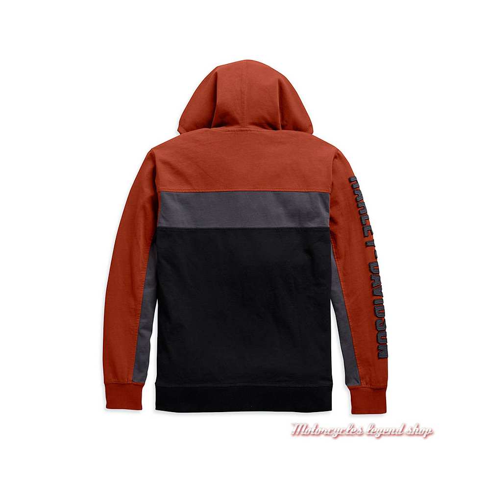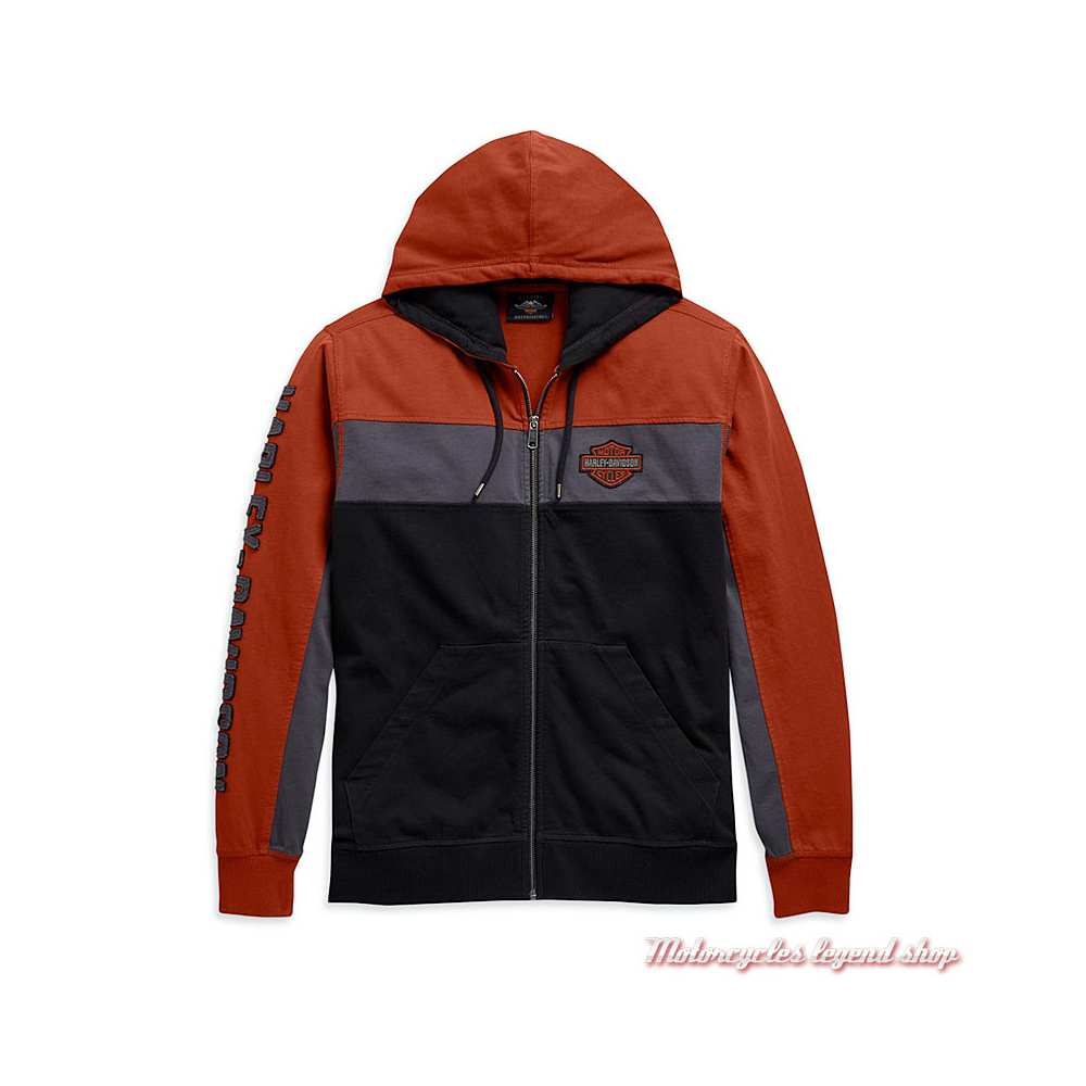 100 % coton. Fermeture zippée. Capuche doublée contrastante à cordon de serrage. Deux poches style kangourou. Graphisme Bar & Shield® brodé sur la poitrine gauche. Graphisme Harley-Davidson® brodé sur la manche droite.