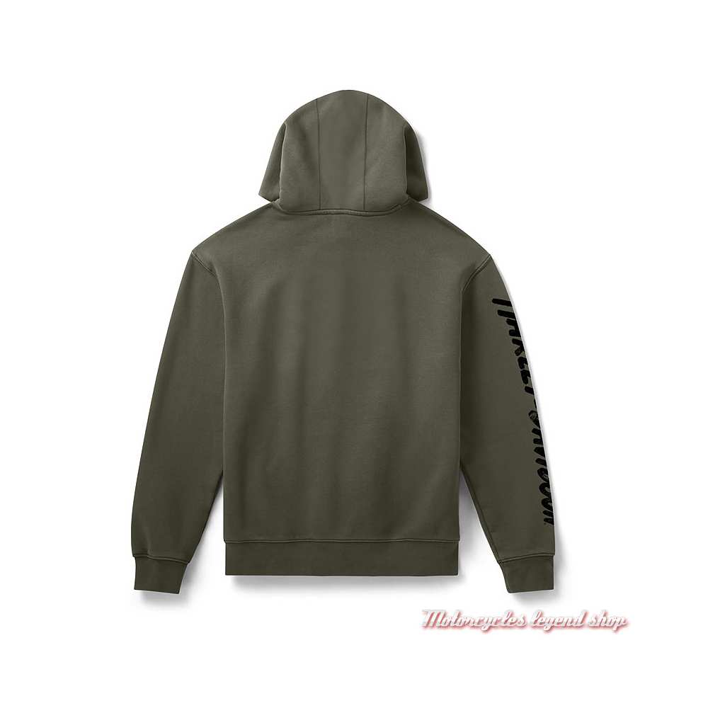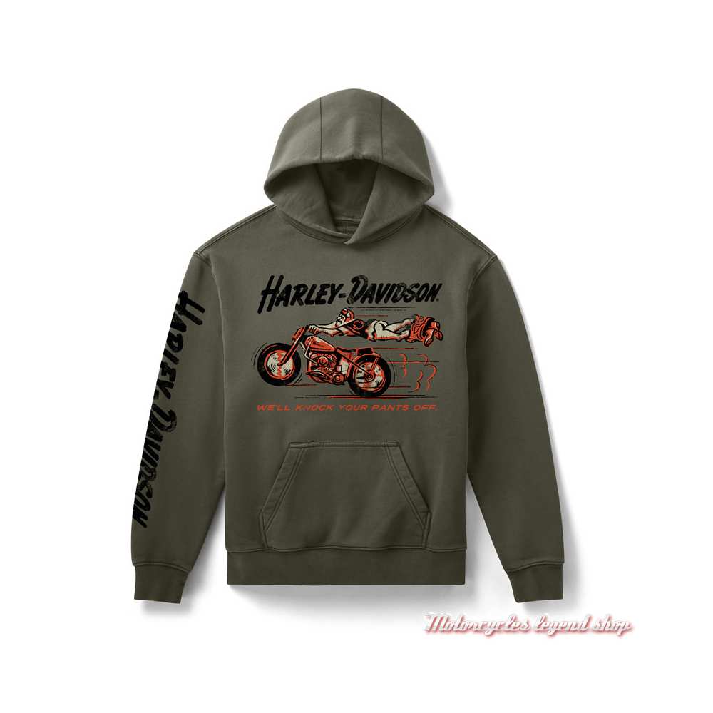 Sweat à capuche 64% coton, 36% molleton polyester. Capuche doublée avec cordon de serrage. Poche kangourou. Poignets et taille côtelés Graphisme Harley-Davidson® humoristique imprimé sur la poitrine. Graphisme Harley-Davidson® imprimé sur les manche droite.