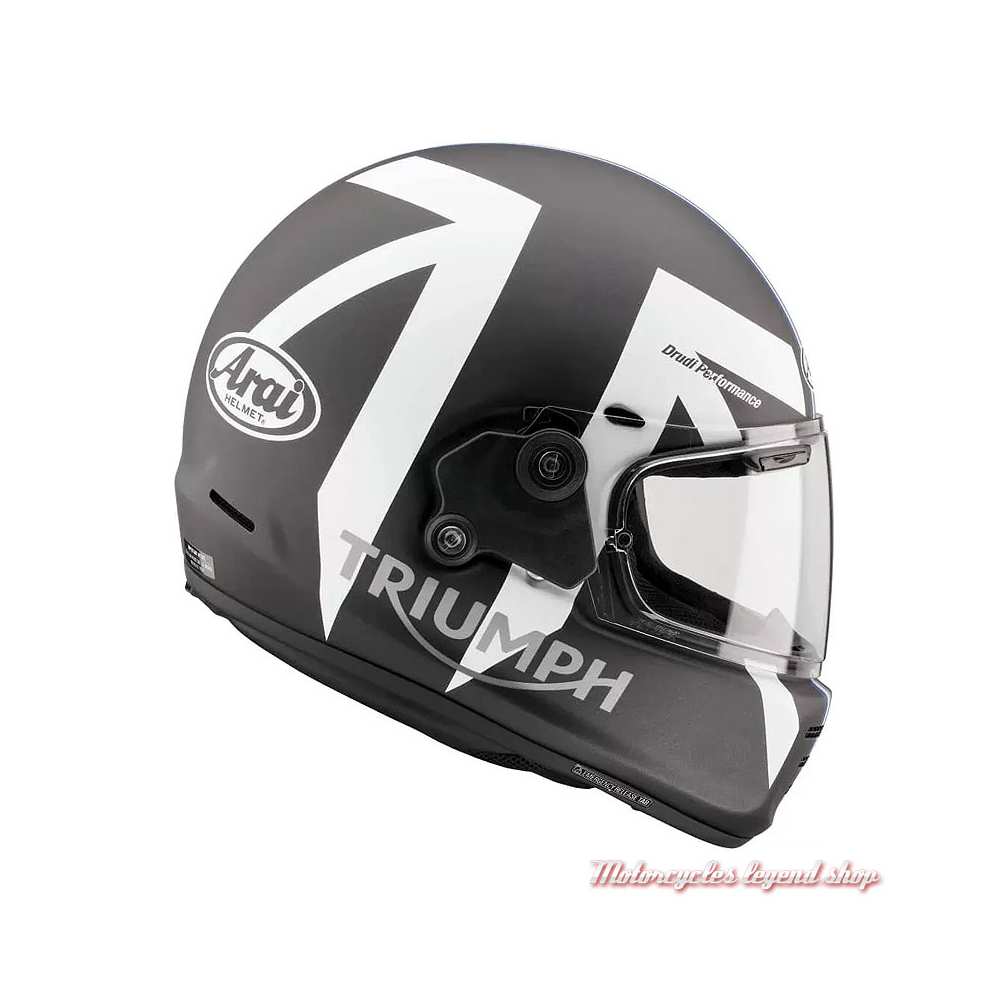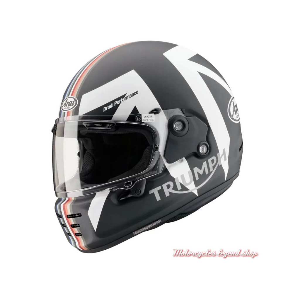 Coque extérieure PB e-cLc en construction stratifiée complexe de dernière génération, avec ceinture périphérique de renfort, très résistante. 3 tailles de coque. Entrée d'air réglable sur la mentonnière et extracteur d'air à l'arrière. Système de circulation d'air sous le casque FFS Free Flow System. Visière Arai VAS MAX Vision incolore, avec aérations intégrées. Écran anti-buée Pinlock. Calotins intérieurs d'absorption des chocs en EPS multi-densités intérieur très confortable, antibactérien, démontable et lavable. Coussinets de joues avec système FCS contour du visage pour un maintien ajusté sans pression excessive sur le visage. Prédisposé à intégrer le système de communication. Déco Union Jack Triumph.