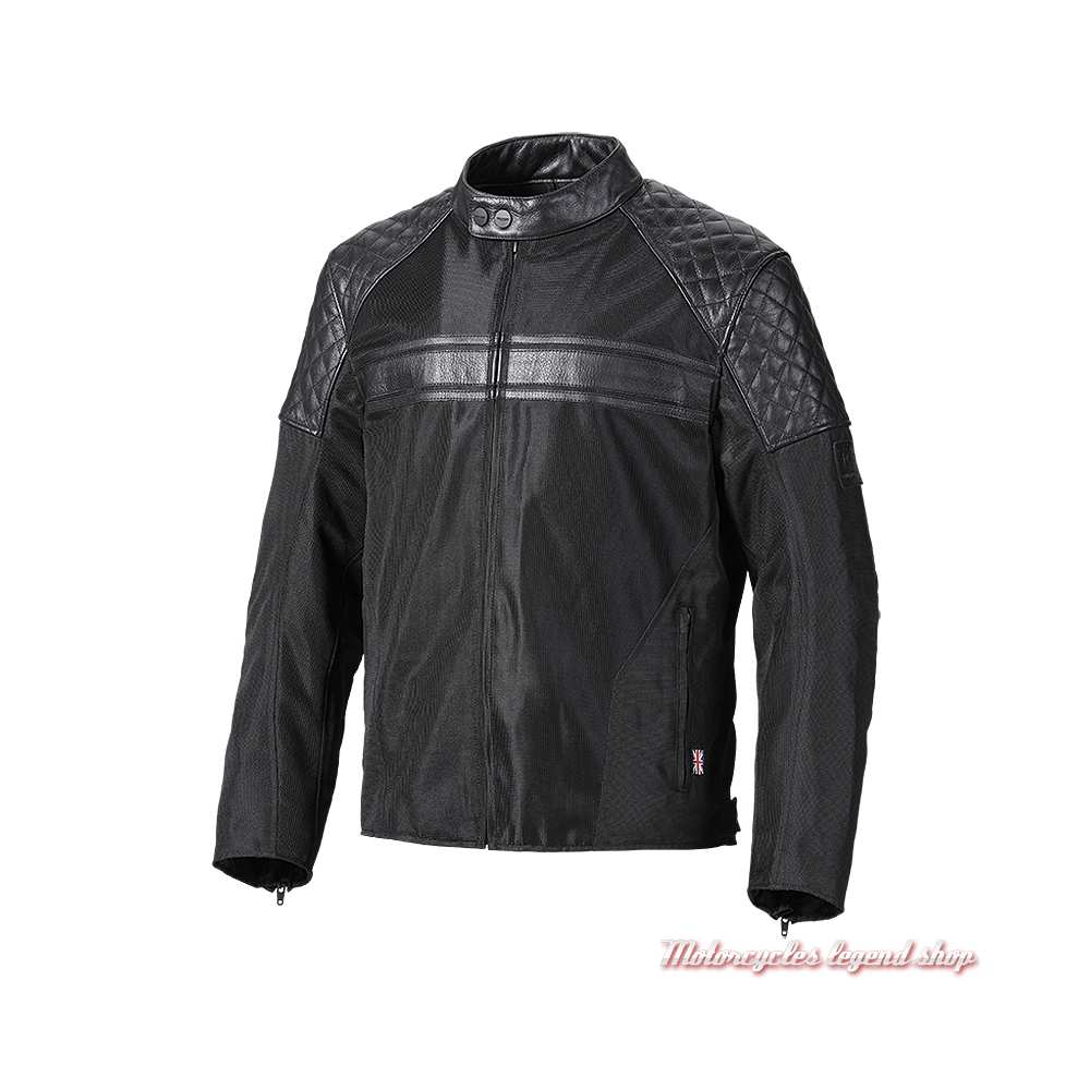 Blouson d'été en maille Airflow, Cordura 500D, doublure amovible imperméable TriTech. Empiècements en cuir épaules, poitrine et col. Taille réglable. Fermeture zippée. Zips aux poignets. Deux poches réchauffe main zippées. Panneaux matelassés sur les épaules et aux coudes. Col officier, fermeture à bouton pression. Protections D3O amovibles au niveau des épaules et des coudes, certifiés CE selon la norme EN 1621-1:2012. Protection dorsale amovible D3O BP4, certifiée CE selon la norme EN1621-2. Zip de connexion aux jeans de la gamme. Graphisme Triumph dans le bas du dos