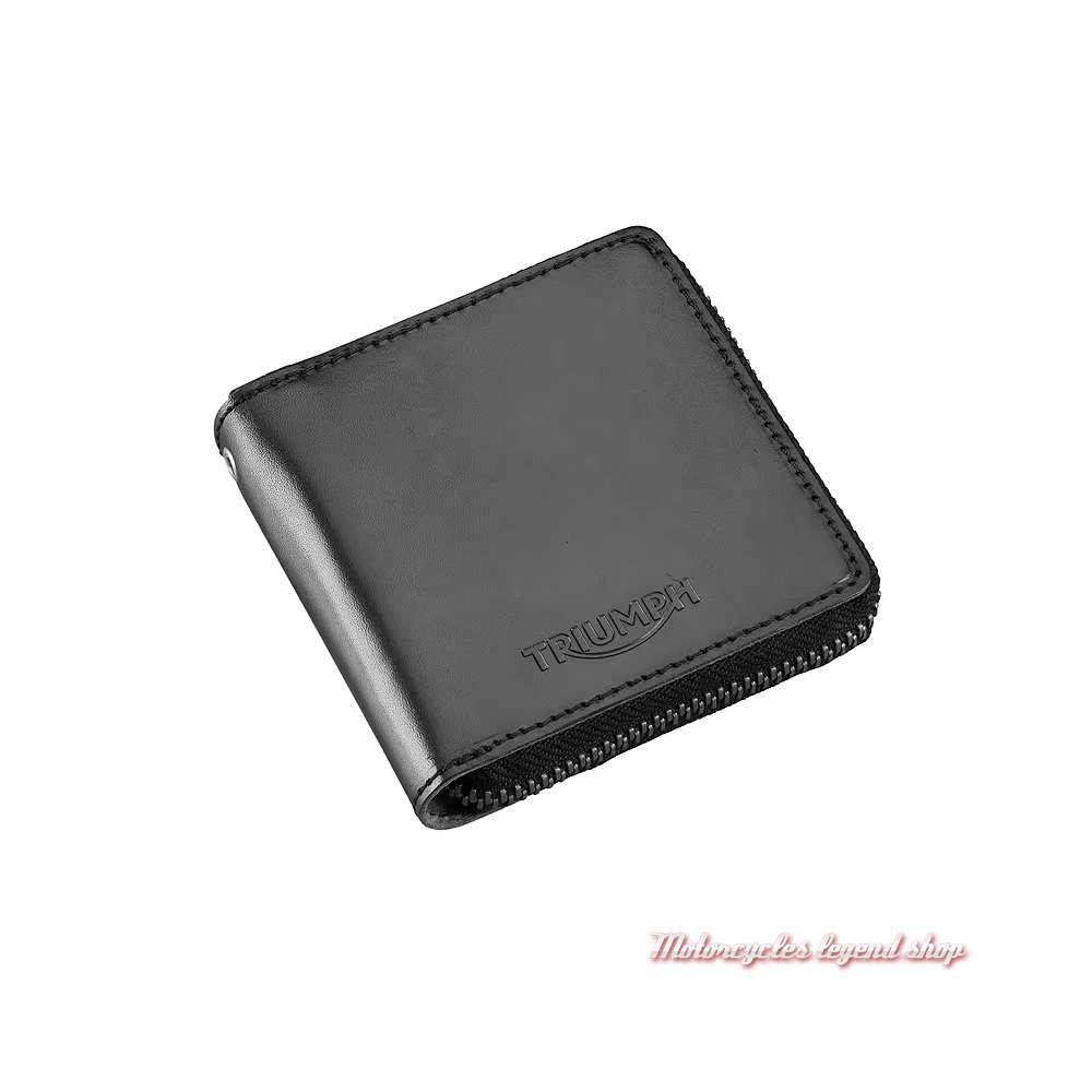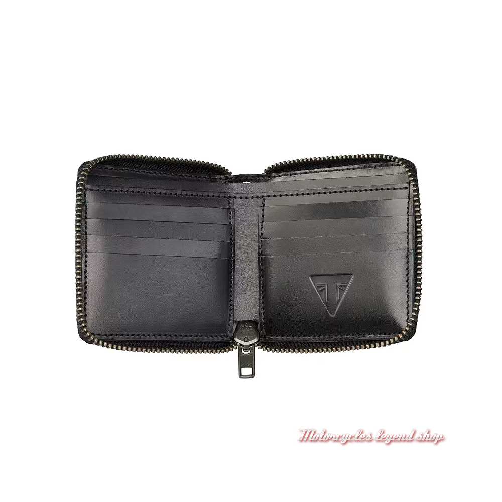Portefeuille en cuir de vache italien. 2 volets intérieurs, 10 compartiments pour cartes. Double compartiment à billets. Fermeture zippée, logo Triumph gravé sur l'avant. Compatible avec chaine de portefeuille (non comprise)