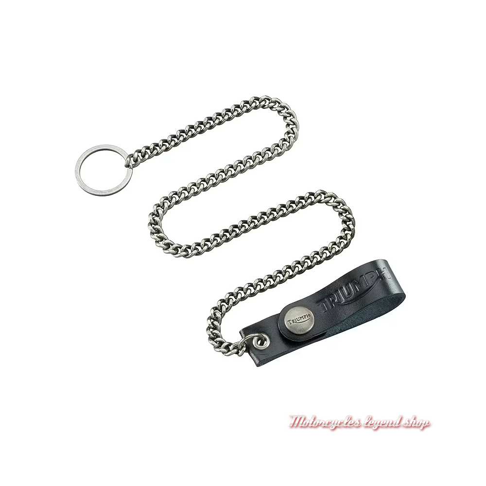 chaine en métal, argent rétro, avec attache ceinture boucle en cuir de vache italien, noir, avec bouton pression, logo Triumph gravé, 1 anneau brisé.