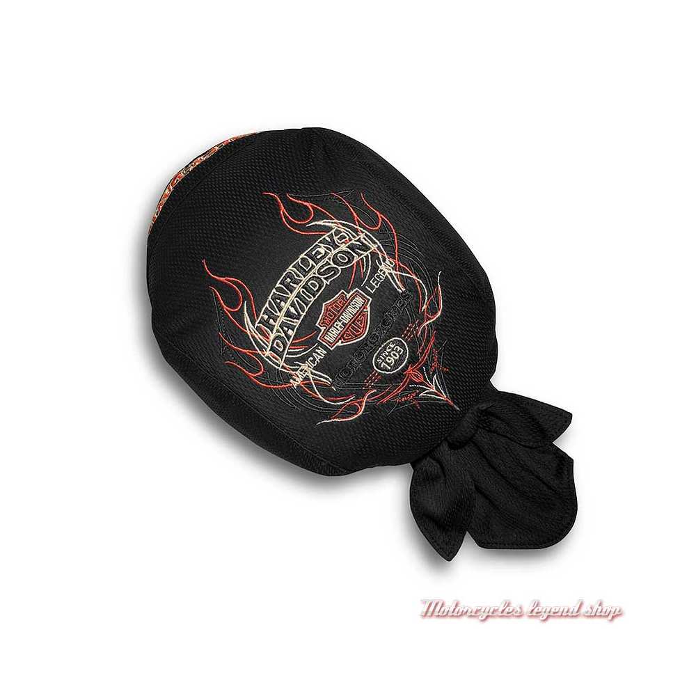 Bandana de tête noué à l'arrière, 100 % polyester, micro perforé. Graphisme Harley-Davidson® brodé devant et graphisme flamming brodé sur le dessus